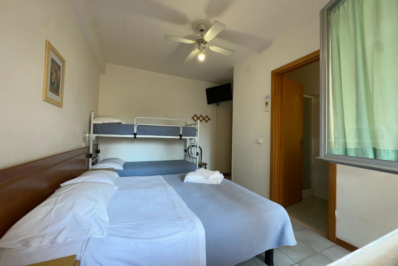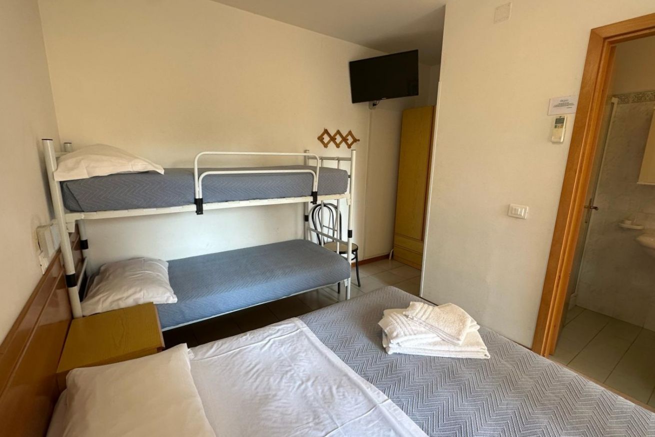 La camera è spaziosa e funzionale, dotata di letto matrimoniale e letto a castello, TV e bagno privato con doccia, WC e bidet. Gli ambienti sono essenziali ma accoglienti, pensati per garantire tutto il necessario durante il soggiorno.